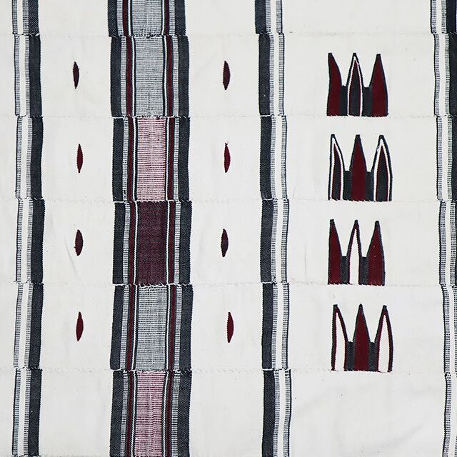 カノからニジェール国境にかけて多く見られるという綴(つづれ)織布です。おもに寝具として使用され、「水平機」を使い男性の織り師によって織られています。布のヨコ糸には引き揃えの綿糸が使われ、白い地色に藍の菱形文様や百足文様を横縞の間で繰り返し、部分的にえんじ色糸も使用されています。