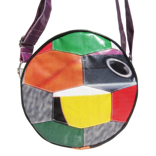 このパッチワークバッグの材料はリサイクルされた野外広告です。広告期間が終わると捨てられてしまう野外広告は、いわば資本主義の消費社会の象徴ともいえます。近年、生活が劇的に変化する西アフリカでは、プラスチック廃棄物の増加が深刻な問題となっています。