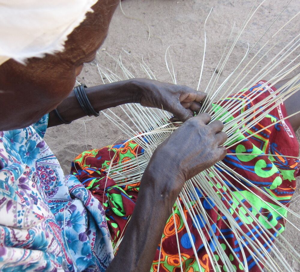 女性達は片道何時間もかけ素材のイララパームを採取し、村の一角に集まり皆でゆっくりかごを編みます。