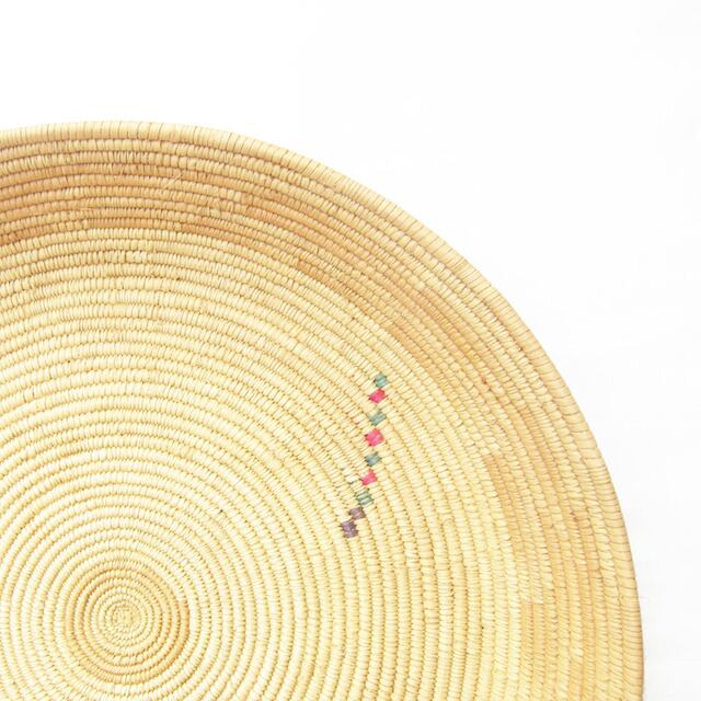 フラニ族によって作られたラフィアヤシの平たいかごです。西アフリカの多くの国に分布するフラニ族、遊牧民を起源とする彼らは今でも多くの人が牧畜をしています。