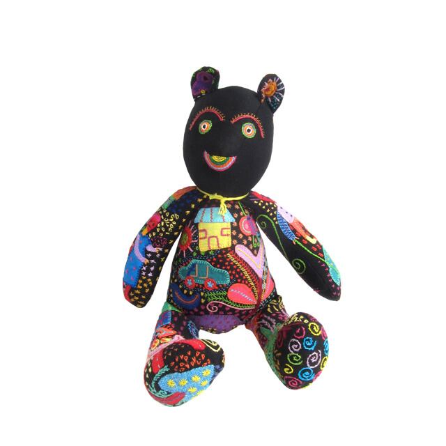 このくまのぬいぐるみは、南アフリカの女性刺繍グループによって作られました。想像力豊かな、色とりどりの手刺繍で埋め尽くされた、贅沢なぬいぐるみです。