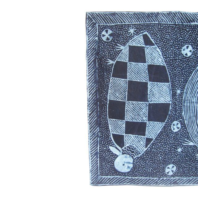 作り方は、キャッサバのでんぷん糊を鳥の羽やほうきの枝につけ、柄を手描きし、布を藍染めします。使用するヨルバ藍珍しい性質と独特の美しい色を持つ藍植物です。